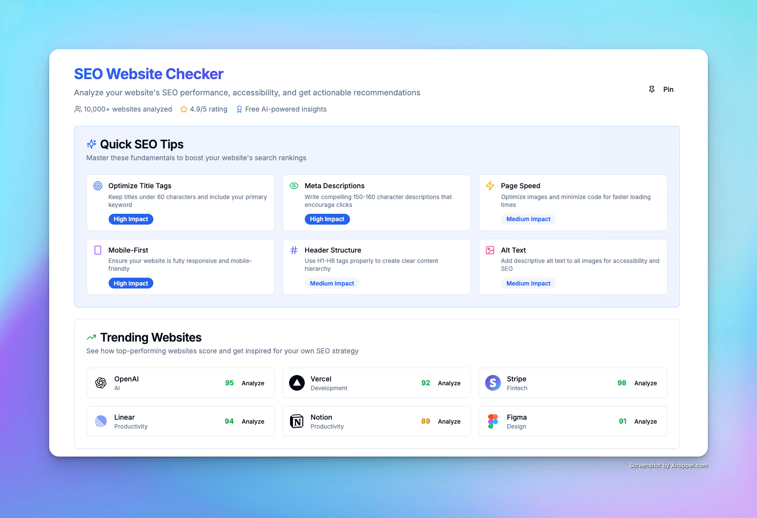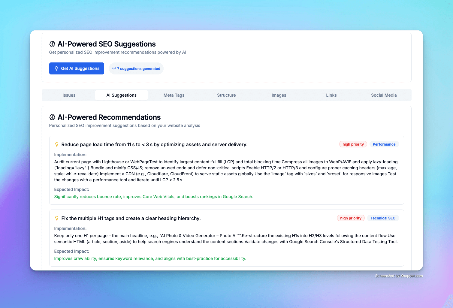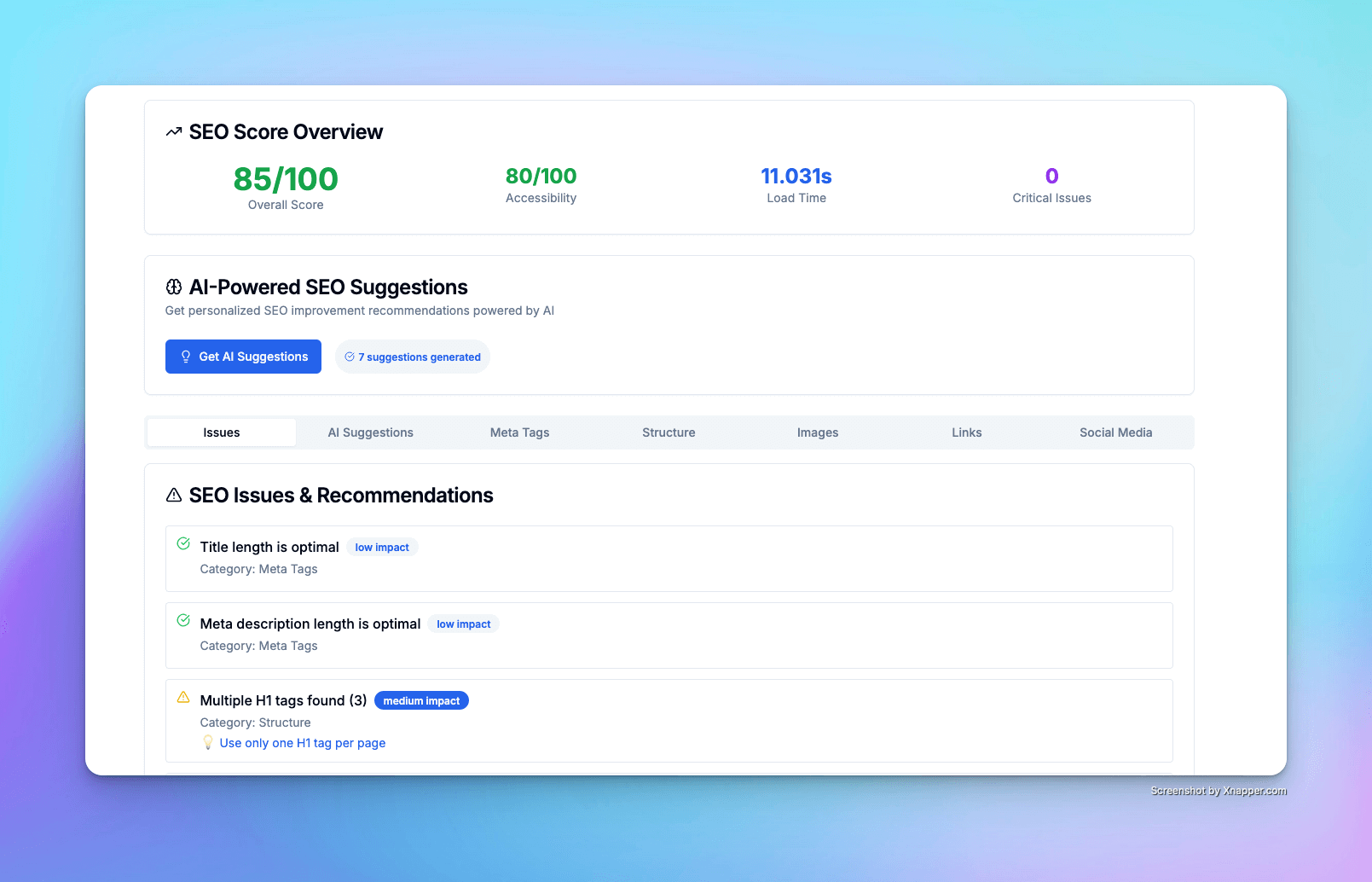 You can instantly analyze your website’s SEO performance using Toolover SEO Checker — a free tool that audits your site’s SEO, accessibility, meta tags, heading structure, image optimization, links, and social media metadata. It provides personalized AI-powered recommendations, and you can export the report as JSON or PDF for further use.